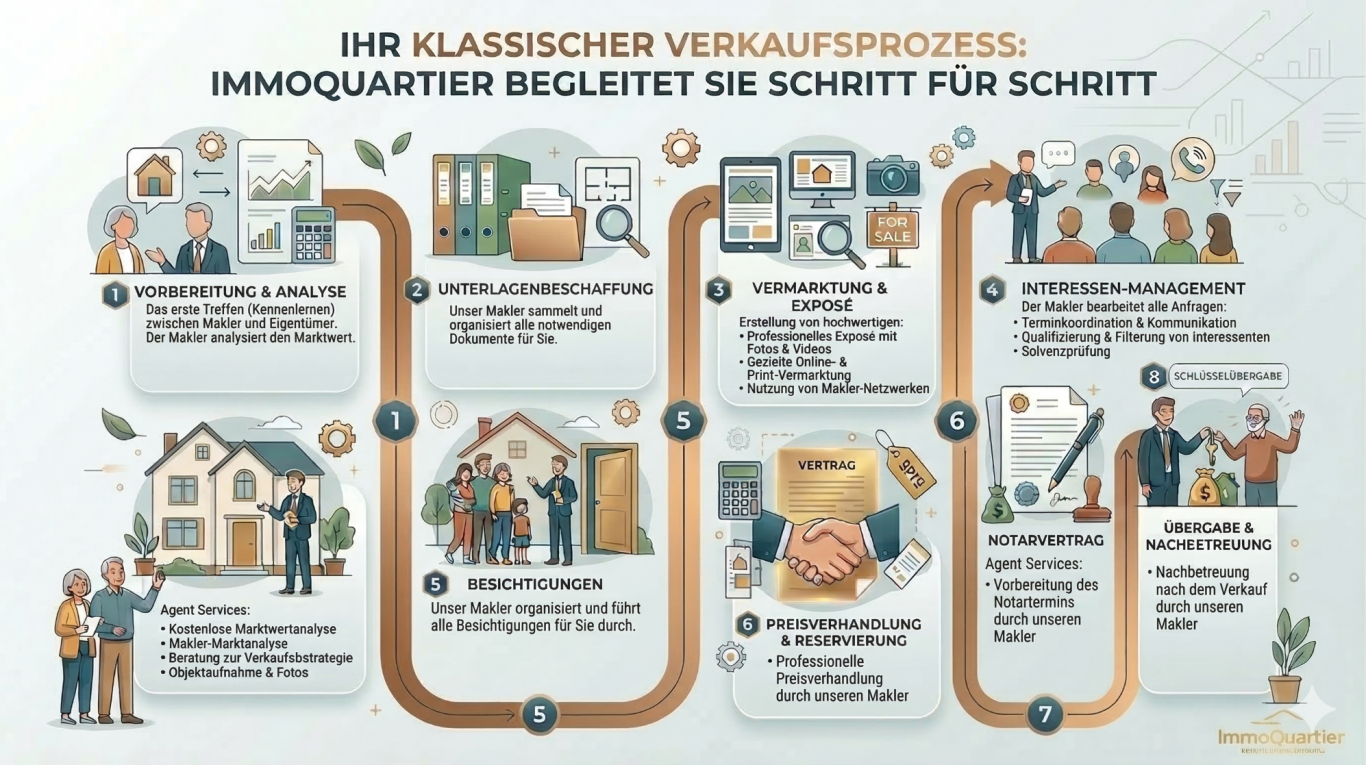 Nach dem erfolgreichen Vermarktungsstart begleiten wir Sie Schritt für Schritt – von der Erstberatung über Besichtigungen bis hin zur notariellen Vertragsunterzeichnung. Unsere Mission: ein sicherer, effizienter und gewinnbringender Verkaufsprozess.